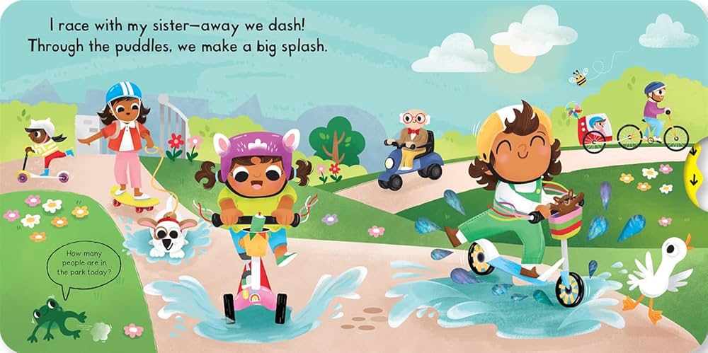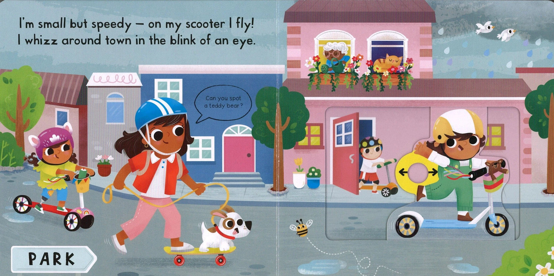 Push, pull and slide the tabs to freewheel through the pages in Busy Scooters! Whizz round the town on your speedy scooter, try out new tricks at the park, and spend a sunny afternoon racing with friends!