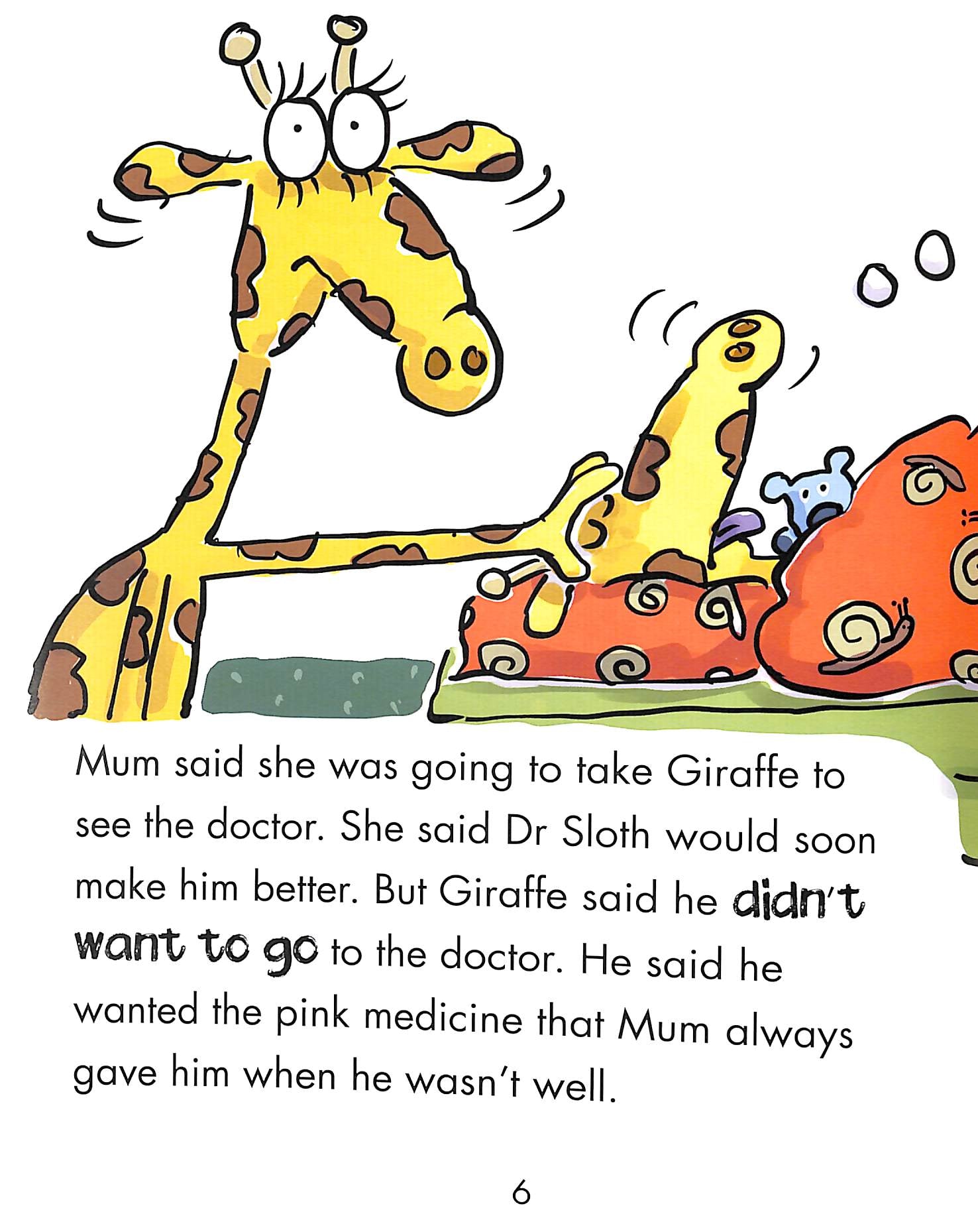 Giraffe is not feeling well. She has a hot head and a sore throat. Mum says Giraffe will need to visit the doctor. Giraffe feels nervous, but the doctor is very gentle and she is soon feeling better.