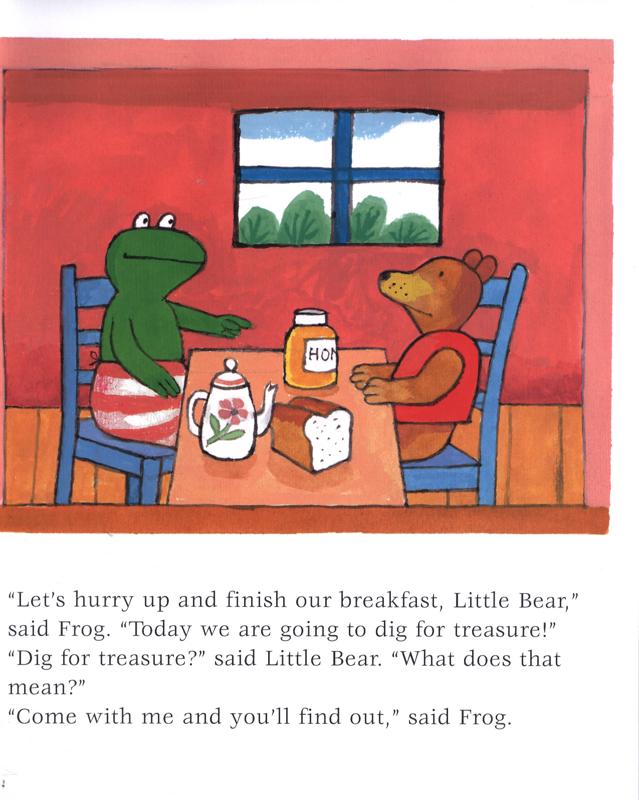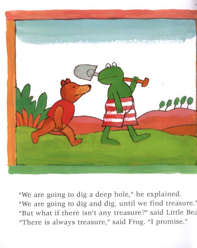 Frog and Little Bear go off to dig for treasure. 'But how do you know there will be treasure?' says Little Bear.'I just know,' says Frog. So together they dig a hole; a hole so deep that once they are in, they can't get out. Who will rescue them? And at the end of it all, will they have discovered treasure? Of course they will.
