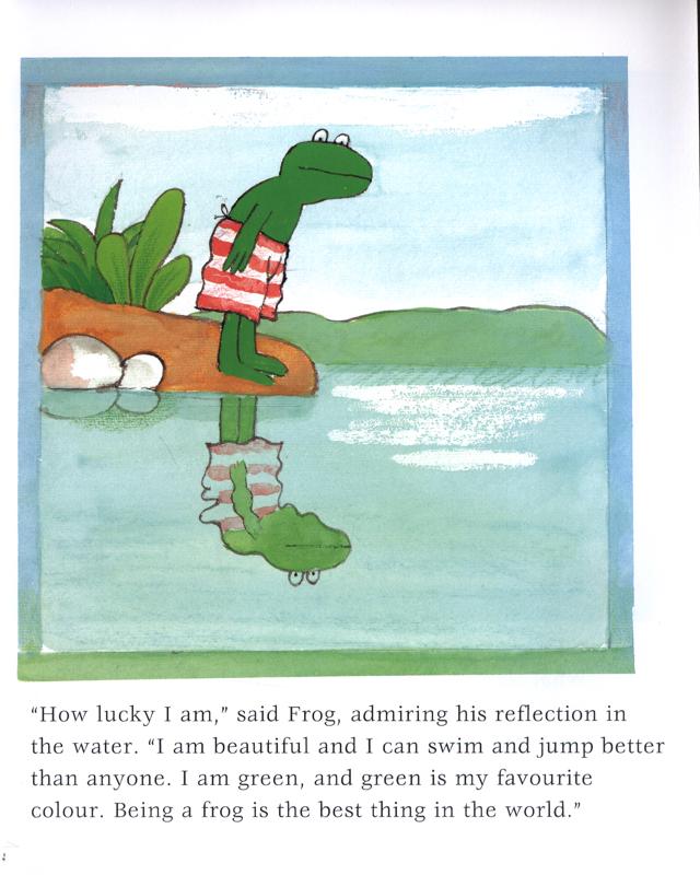 Frog is not content to be just a plain green frog, he wants to do the things his friends can do. He tries to fly like Duck, to bake cakes like Pig and to read like Hare. But all his attempts are doomed to failure, and Frog is disconsolate, until Hare points out that his friends love him just the way he is. And in any case, he can swim and leap better than any of them!