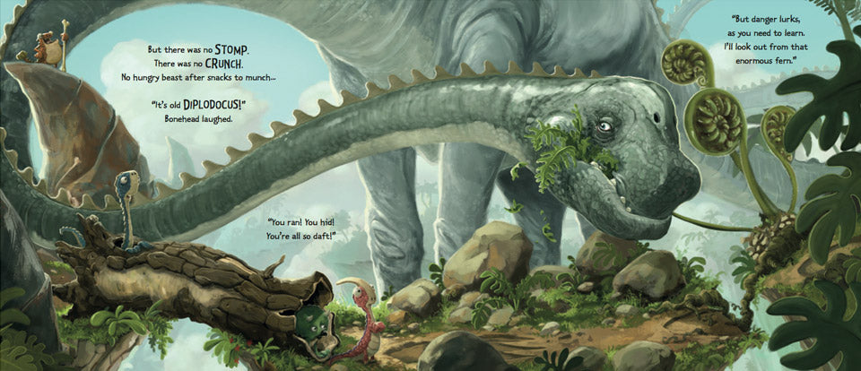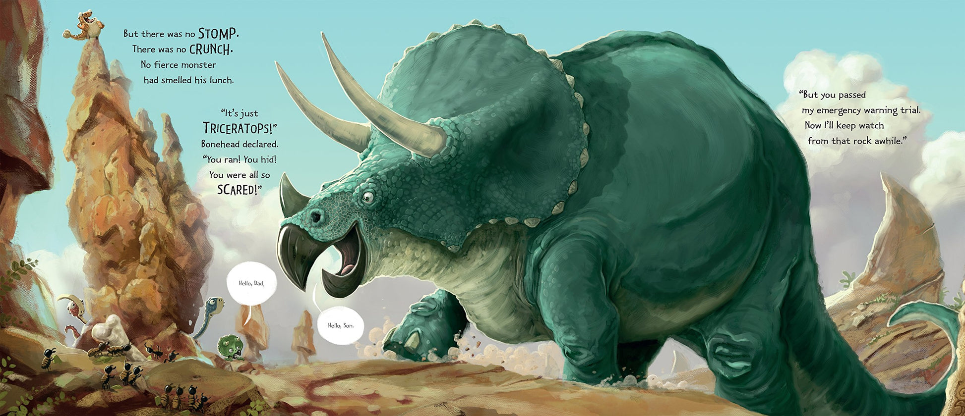 But Bonehead, the lookout, quickly gets bored, and he can’t resist shouting, “GIGANTOSAURUS!” just to see what the others do. When his friends finally wise up, Bonehead is in for a rather snappy (and crunchy) surprise!