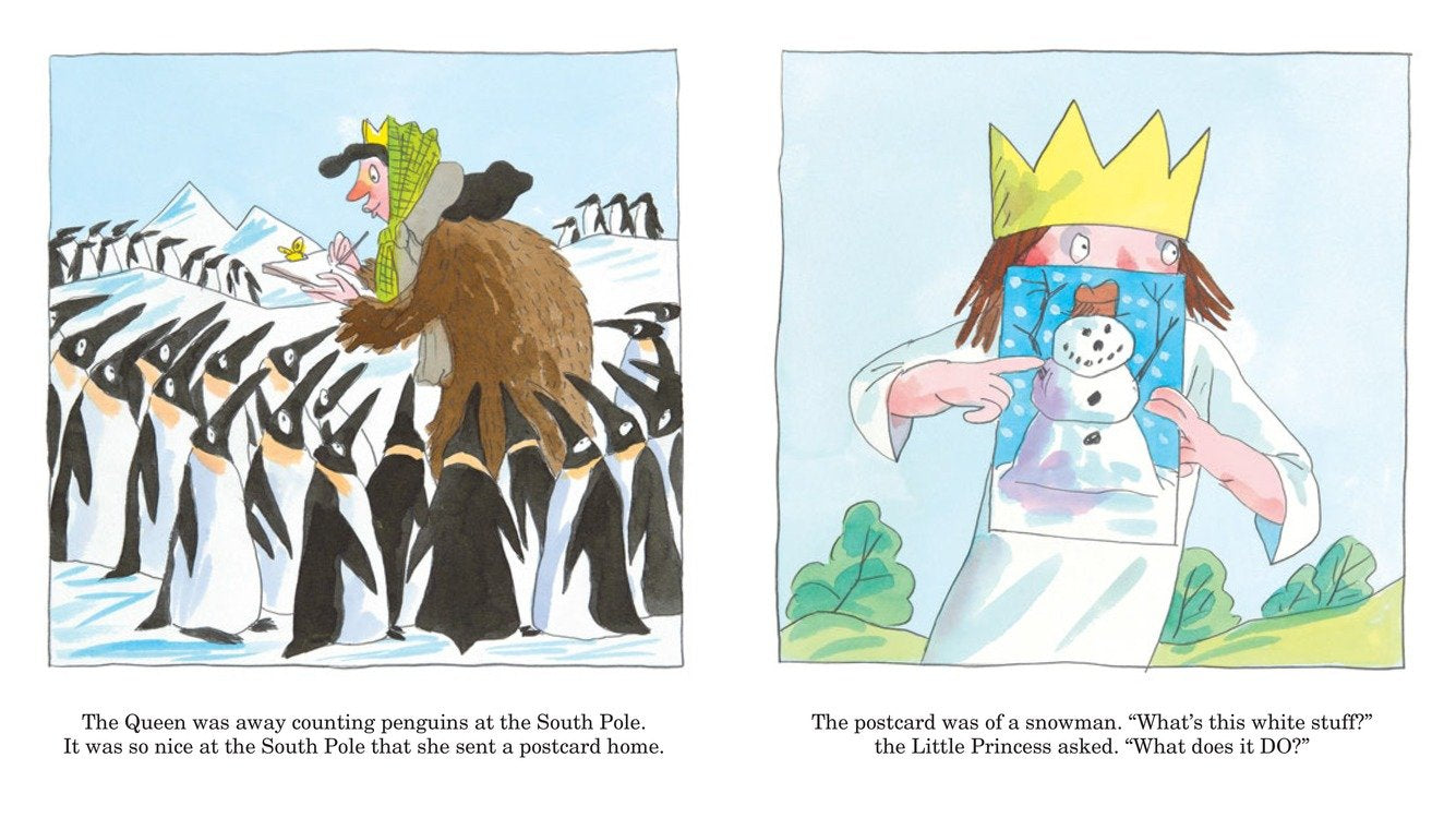 When the Queen goes on a trip and sends back a photo of her feeding some penguins, Little Princess decides she wants snow too. The whole palace tries all kind of things - from sandmen instead of snowmen to mudballs instead of snowballs. But this little royal won't be satisfied until she gets what she wants... and sometimes not even then!