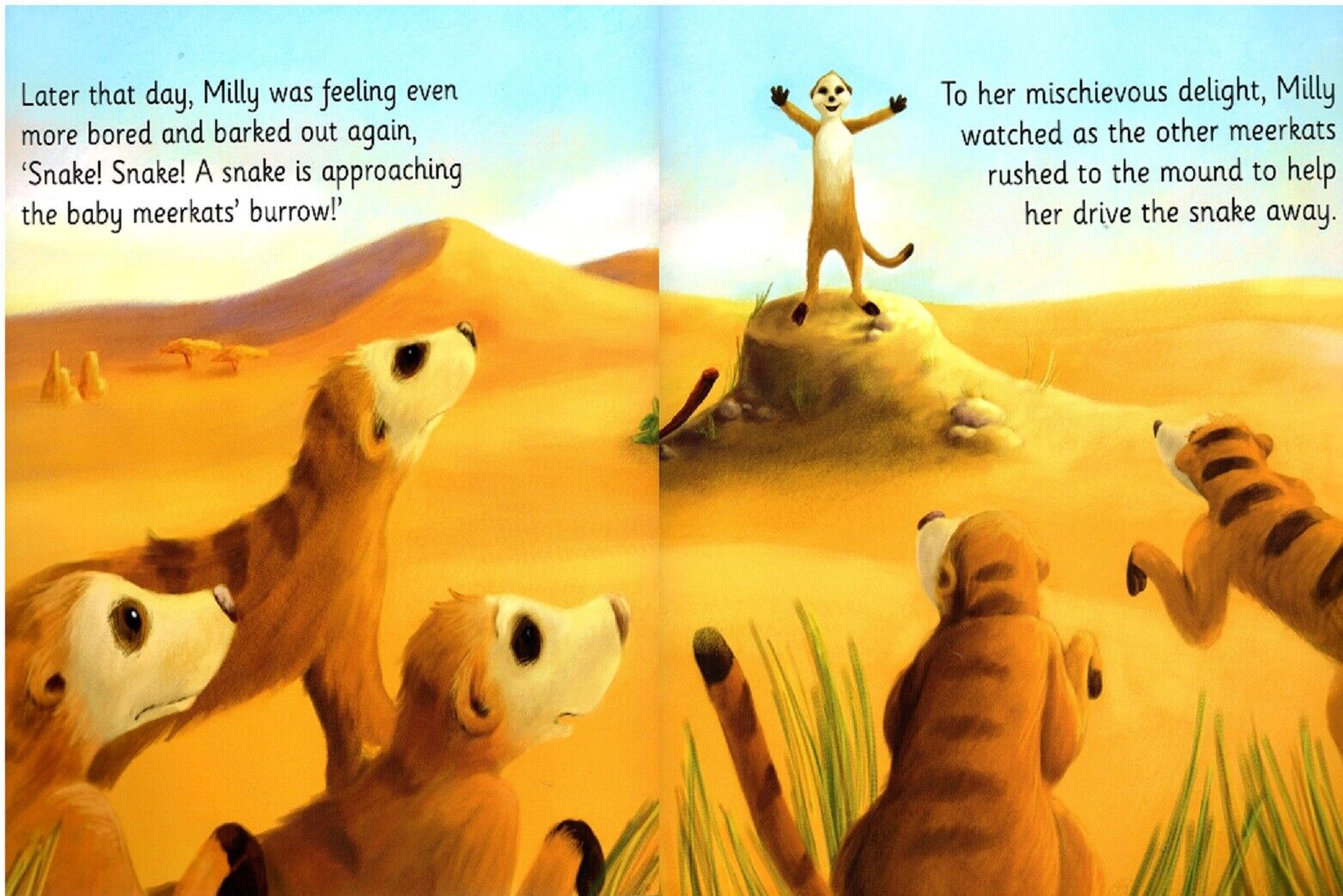Whilst on lookout duty, mischievous Milly the meerkat gets bored and decides to play a trick on the other meerkats to amuse herself. But when Milly needs help, she learns an important lesson.