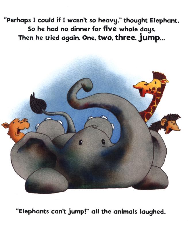 When the other baby animals laugh at Elephant for not being able to jump, he sets out to prove them wrong. But hard as he tries, he just can't jump. Then he realises that he is able to do something that no other animal can - his strong, long trunk can make him a hero.