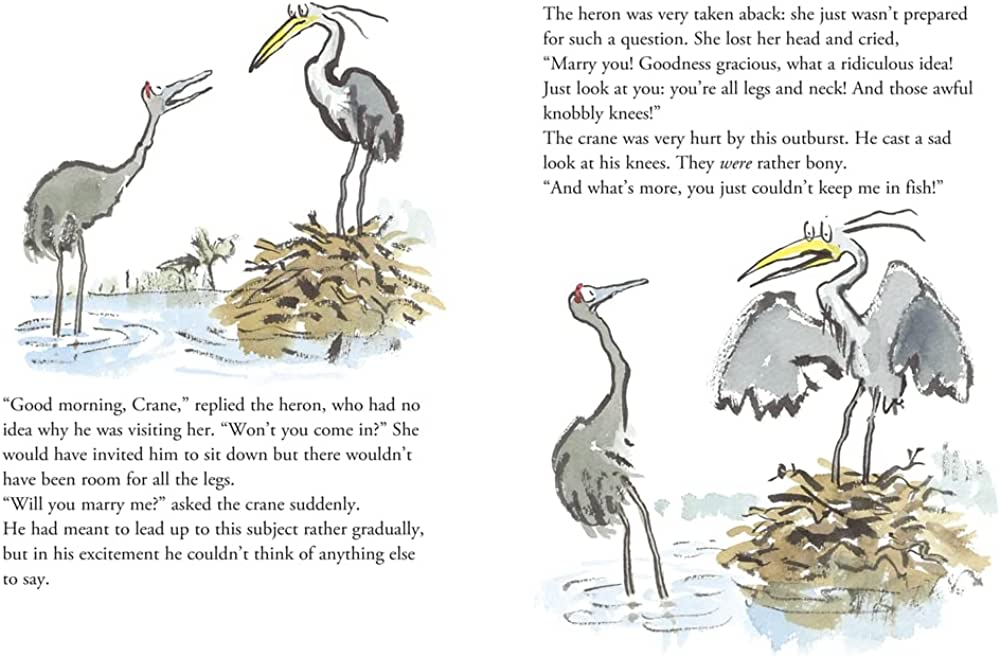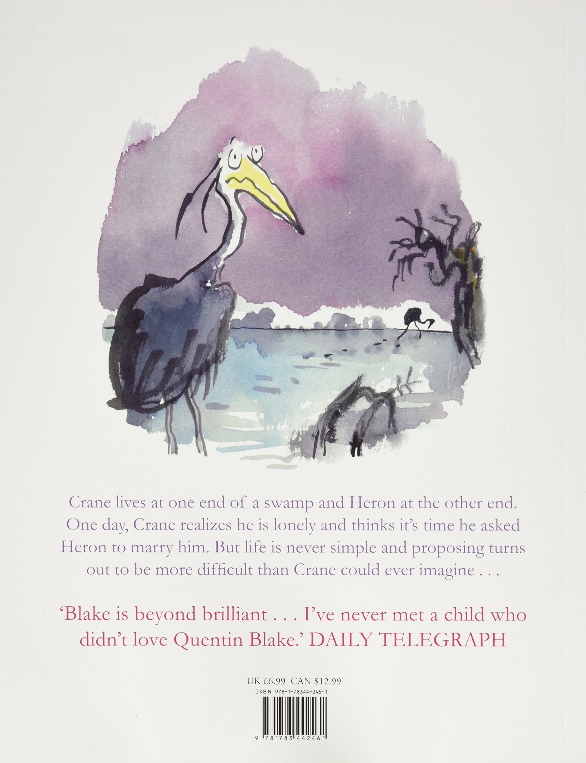 Crane lives at one end of a swamp and Heron at the other end. One day, Crane realizes he is lonely and thinks it's time he asks Heron to marry him.