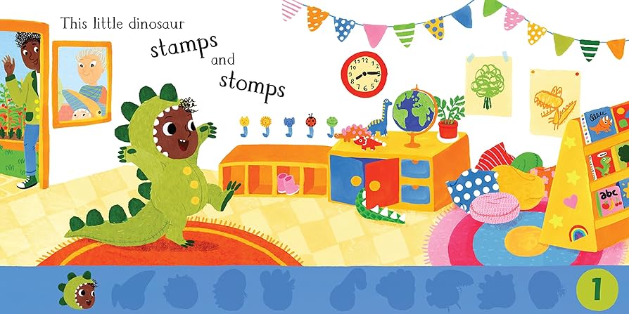 It's dress-up time! In their colourful costumes ten excited children become noisy, roaring dinosaurs and an ordinary preschool classroom becomes a fantastical prehistorical world where anything is possible! Go along with the little dinosaurs as they stomp, swoop and roar before running all the way home!
