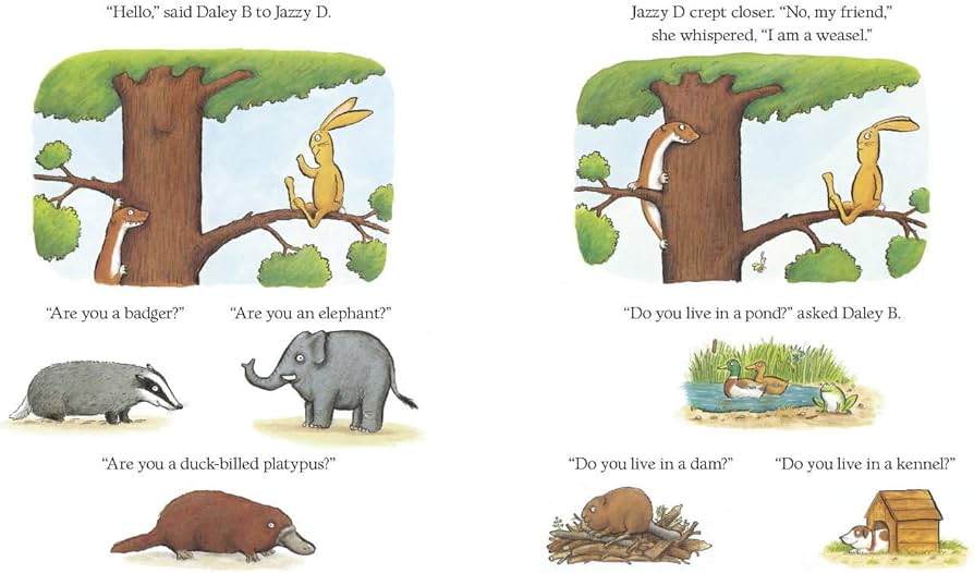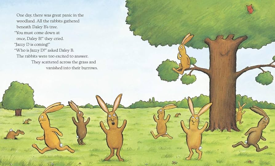 Then, one day, there is panic in the woodland. The wicked weasel Jazzy D is on her way – and she eats rabbits! But Daley B is unperturbed – and when Jazzy D attacks, he finally finds a use for his big feet and kicks her. He also finds out what he is – a hero!